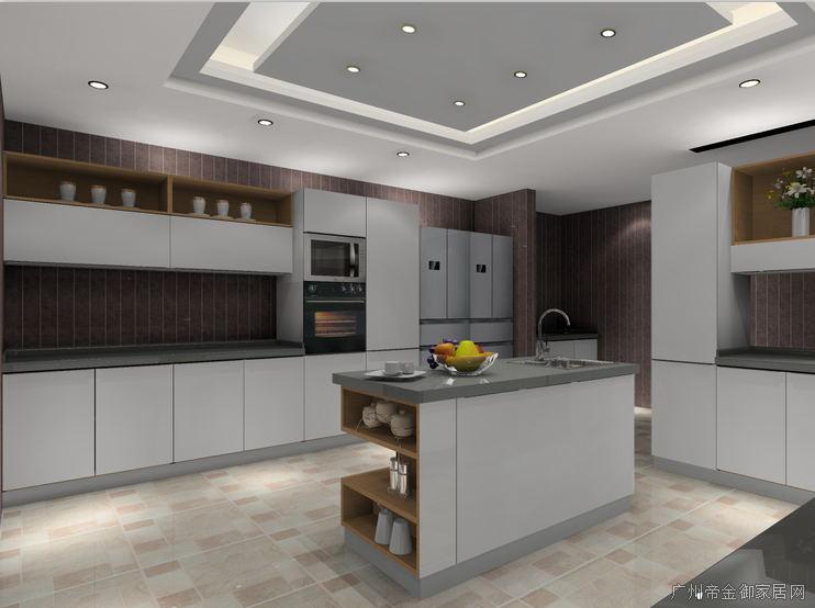 南方空氣環境濕潤,廚房地板不時會潮濕,廚房踢腳線設為八厘米,不僅可有效防蟑螂老鼠而且防潮性極佳,不會因霧水的滲入使櫥柜壽命降低,且柜體采用防潮板可大大提高櫥柜壽命。櫥柜右邊為L型工作臺,可在其進行工作烹飪,吊柜門板采用百隆自動感應開關鉸鏈所以沒有設計拉手,櫥柜中島下方設計為開放式,可放置水杯等小零件物品,櫥柜左邊為一字型餐桌加功能柜,可在此進行用餐,一家人坐在一排享受便捷生活帶來的快樂與溫馨。