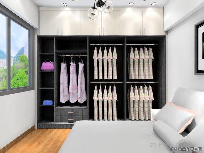 衣柜主要以掛衣服為主,左邊層板放置疊衣服,上邊平開門可放置棉被或行李箱整個(gè)空間收納模式較為優(yōu)秀、簡(jiǎn)單、實(shí)用。顏色搭配選擇了黑色+木紋給人感覺較為安靜睡眠方面更為舒暢。